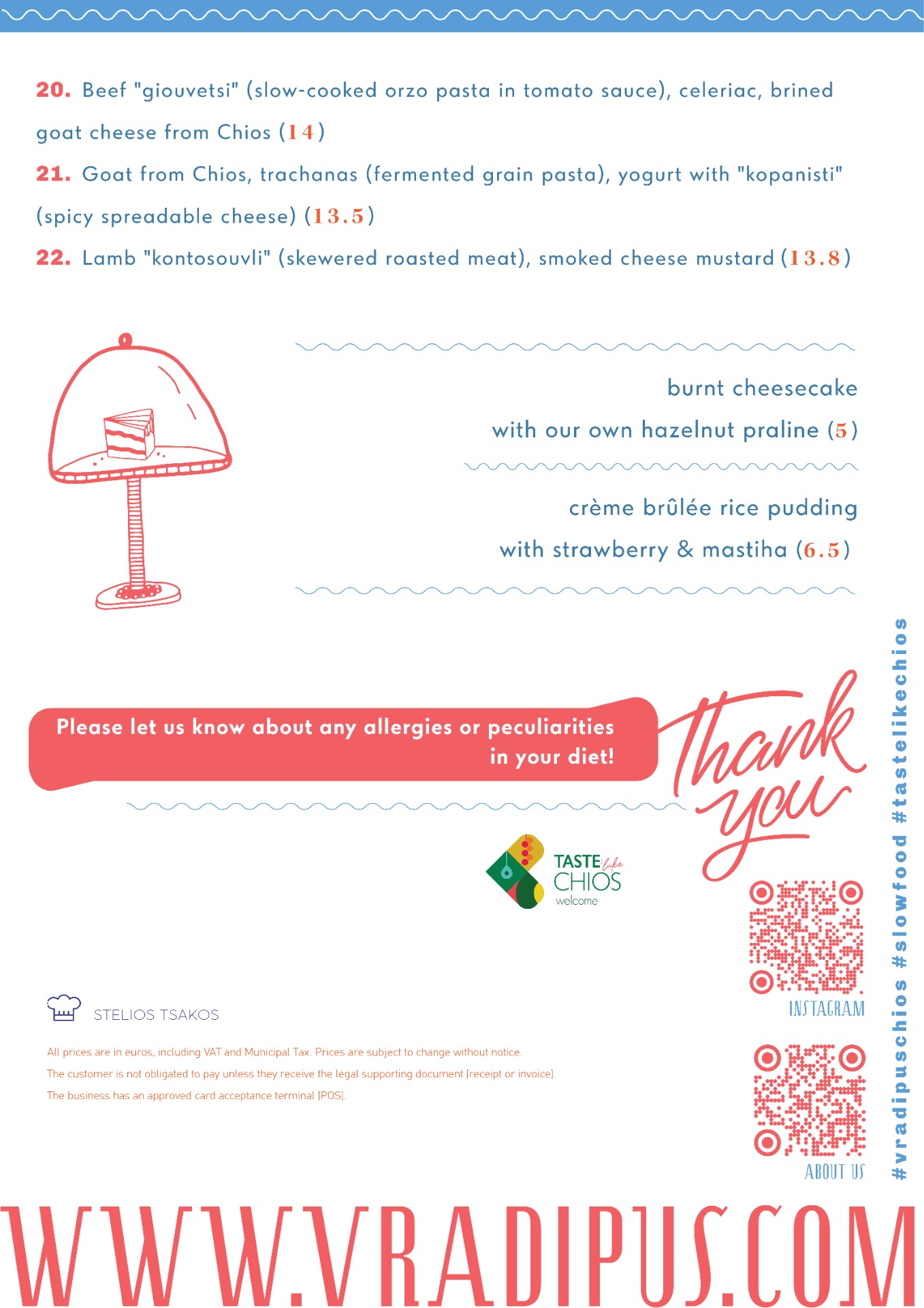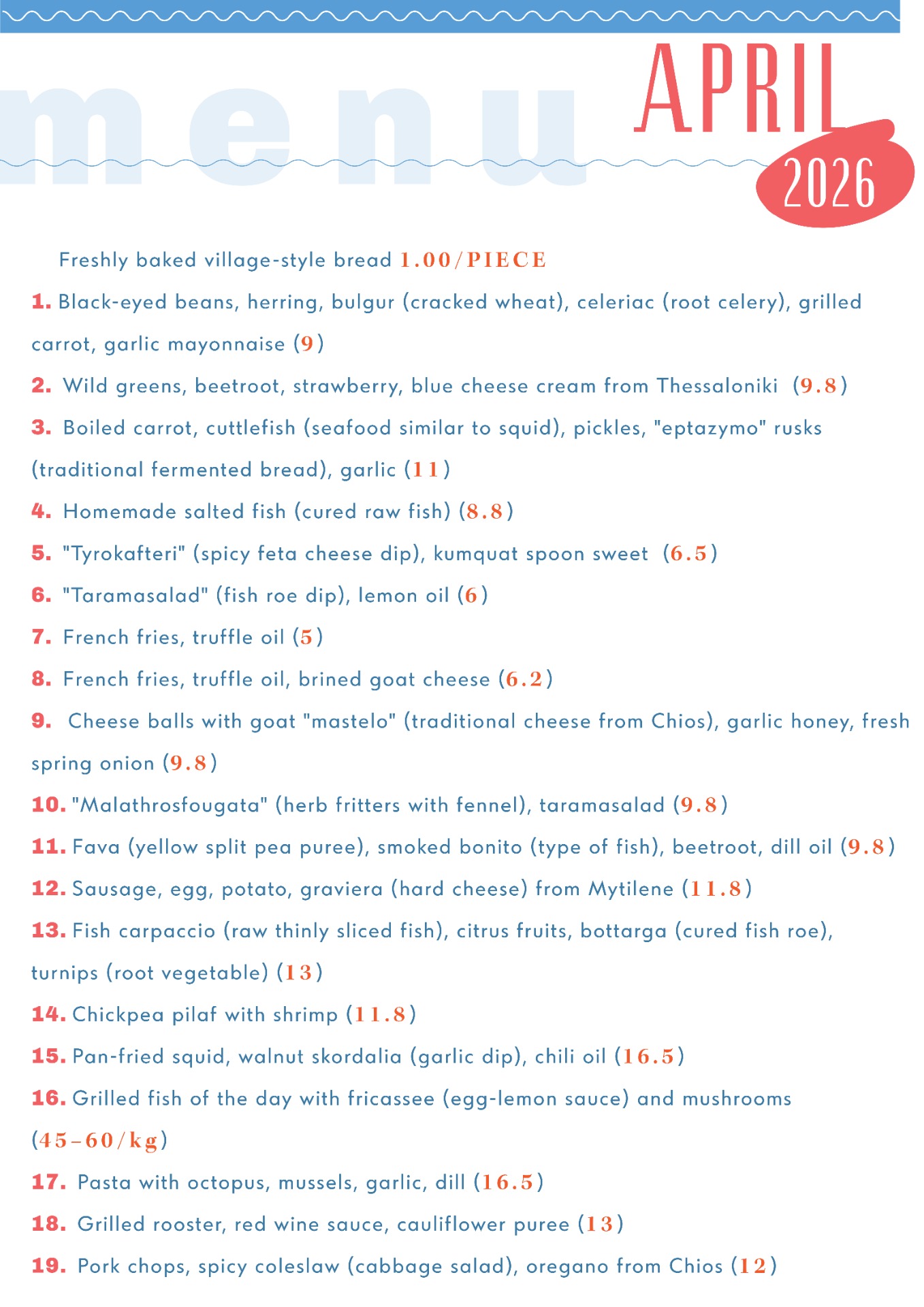 σάλτσα από ζυμωμένες κόκκινες πιπεριές, ψητό φρούτο εποχής, τσαλαφούτι (μαλακό τυρί), ασπέτσα Χίου (μείγμα μπαχαρικών)